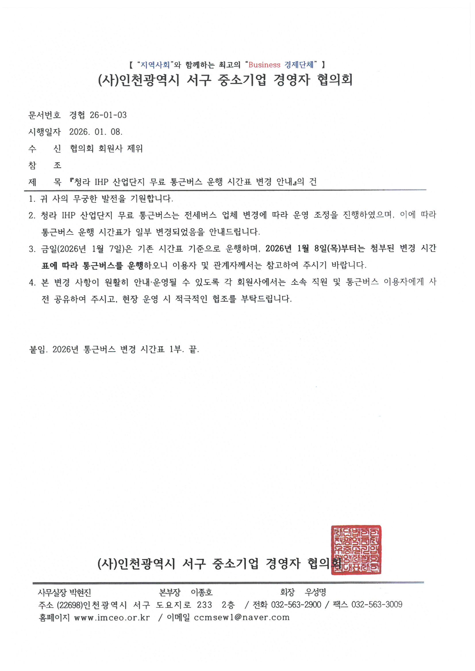¡ºÃ»¶ó IHP »ê¾÷´ÜÁö ¹«·á Åë±Ù¹ö½º ¿îÇà ½Ã°£Ç¥ º¯°æ ¾È³»¡»ÀÇ °Ç 2026.01.08
