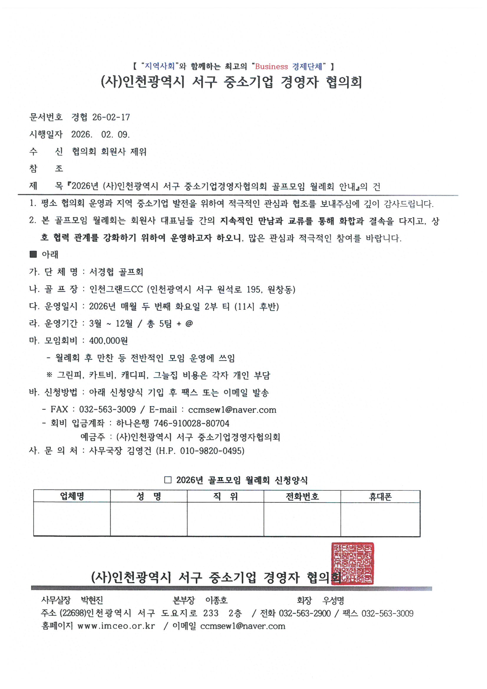 ¡º2026³â (»ç)ÀÎõ±¤¿ª½Ã ¼±¸ Áß¼Ò±â¾÷°æ¿µÀÚÇùÀÇȸ °ñÇÁ¸ðÀÓ ¿ù·Êȸ ¾È³»¡»ÀÇ °Ç